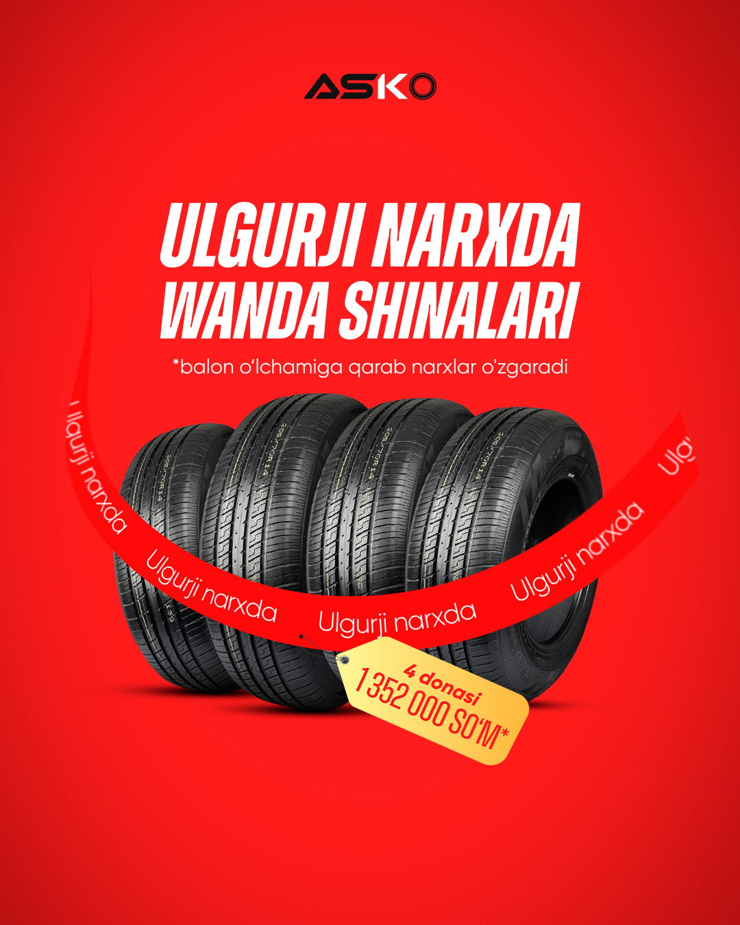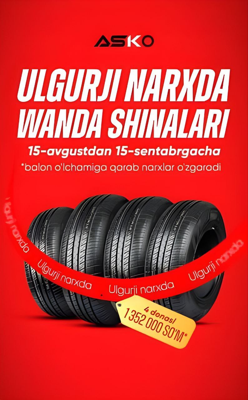 15-avgustdan 15-sentyabrgacha bo‘lib o‘tadigan maxsus aksiya davomida 4 dona Wanda shinasini ulgurji narxda 1 352 000 so‘mga xarid qiling. Endi siz avtomobilingiz uchun sifatli shinalarni bozordagi o‘rtacha narxdan ancha arzon narxga xarid qilishingiz mumkin.