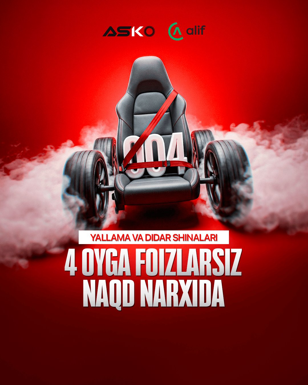 2025-yil 16-dekabrdan, 2025-yil 29-dekabrgacha ASKO do'konlaridan Yallama va Didar shinalarini AlifNasiya ilovasi orqali, 4 oy muddatli, oldindan to'lovsiz va oylik ustamalarsiz xarid qiling!