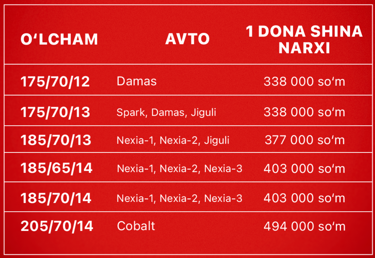 Shinalar narxlari o'lchamga qarab farq qiladi:
